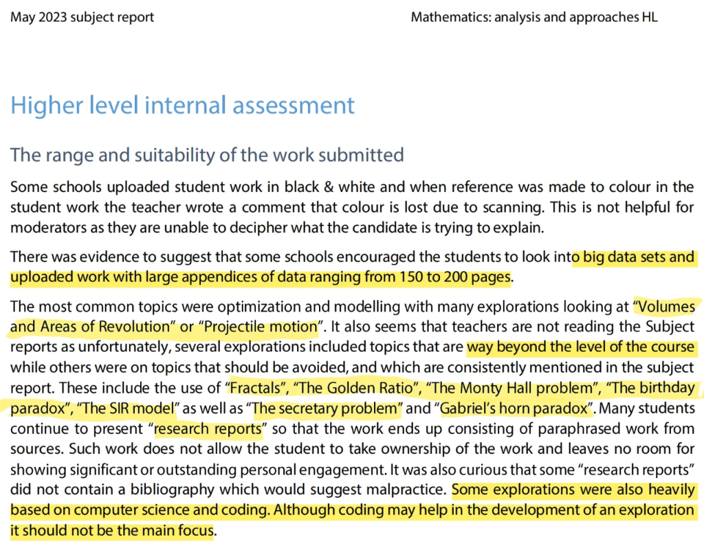 The IB Examiner’s Report mentions a tendency for students to present complex mathematical concepts and equations without knowing how to apply them correctly or even without a clear purpose for their research. In fact, students can avoid this problem even before they write the essay.